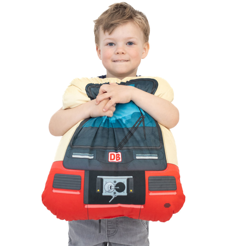 Plüschkissen / Dekorationskissen Nachbildung von: Elektrotriebwagen BR 401 ICE 1 Triebkopf DB AG Farbe: lichtgrau mit roten Streifen Beschriftungsvariante: DB Fernverkehr / DB..