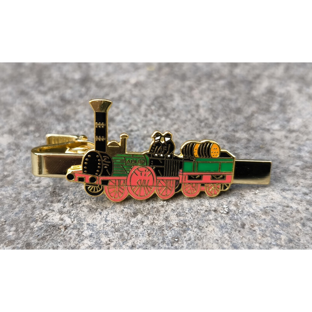 Krawattenklammer aus goldfarbigem Metall mit Abbildung der ersten Dampflok (Adler) in Deutschland.